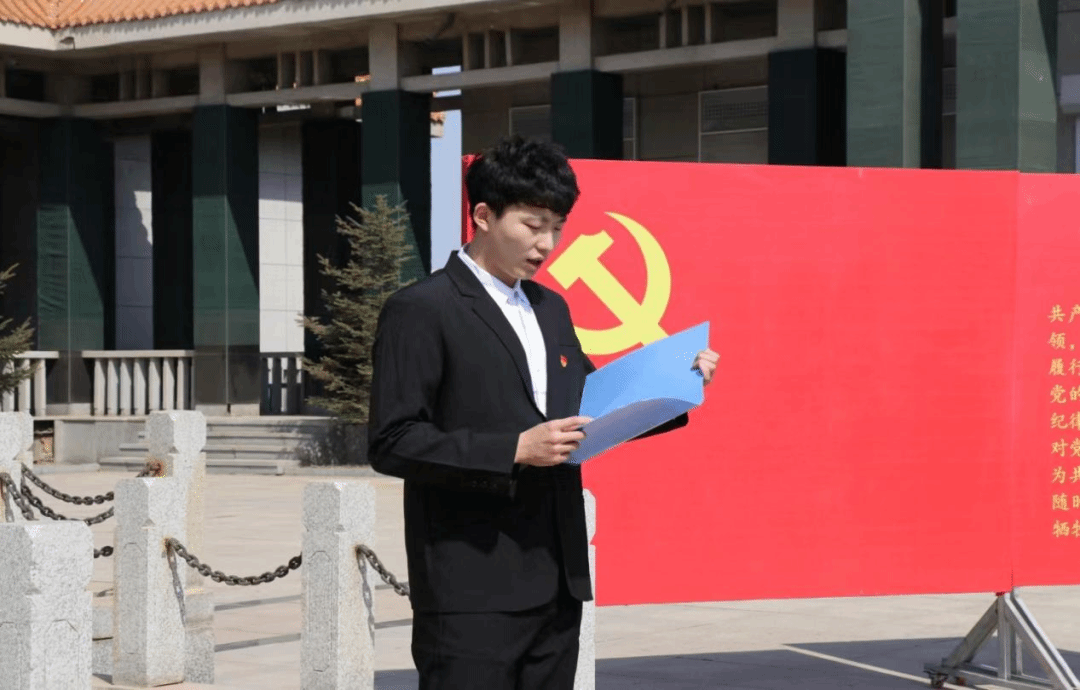 学生党员代表自博231胡峥艳、学生团员代表测控221王金杏分别带领党员、团员重温入党、入团誓词,师生们举起右拳,分别面向革命烈士纪念馆庄严宣誓,铿锵有力的入党、入团誓词响彻革命烈士纪念馆上空。
