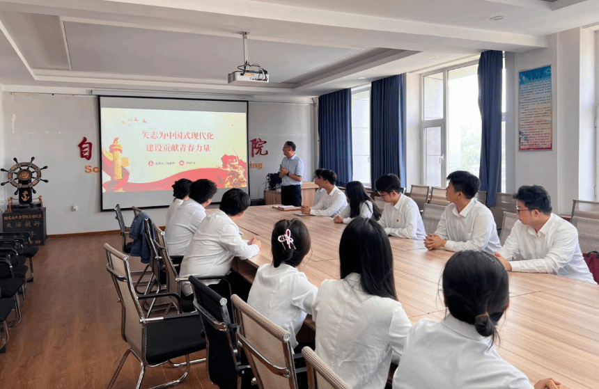 党委书记马崇升以《矢志为中国式现代化建设贡献青春力量》为题讲授学习教育专题党课,党课由学办主任李丹主持,成人影院全体学生党员参会。
