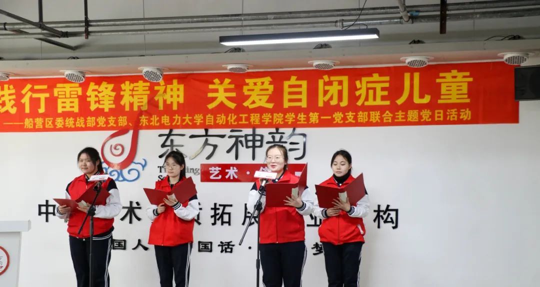 学生第一党支部联合船营区委统战部党支部共同开展“践行雷锋精神,关爱自闭症儿童”主题党日公益活动,本次活动在吉林市东方神韵艺术素质教育学校举行,船营区委常委、统战部部长段继光,船营区委统战部副部长、区民族宗教事务局局长王怀岩,成人影院